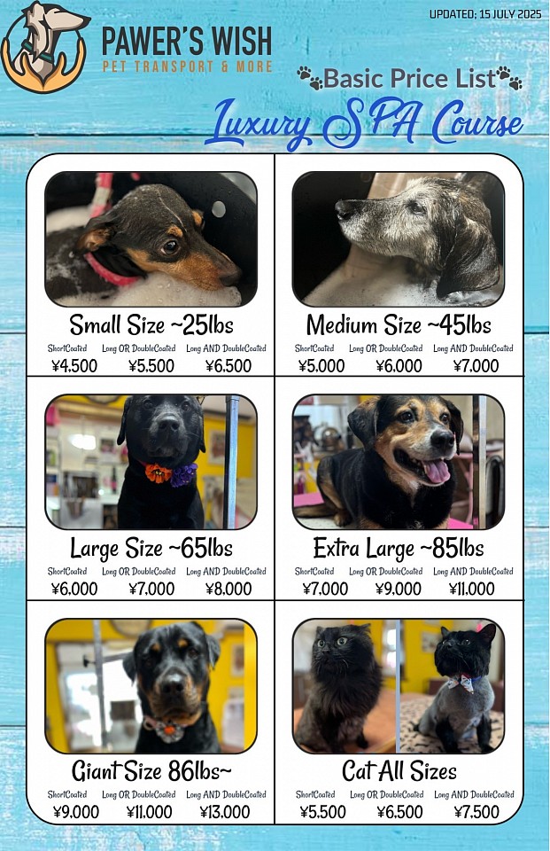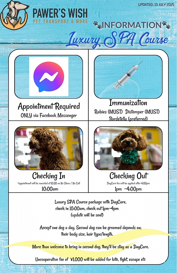 - Regular SPA sessions are only for existing grooming clients and boarding guests— when I am not traveling.