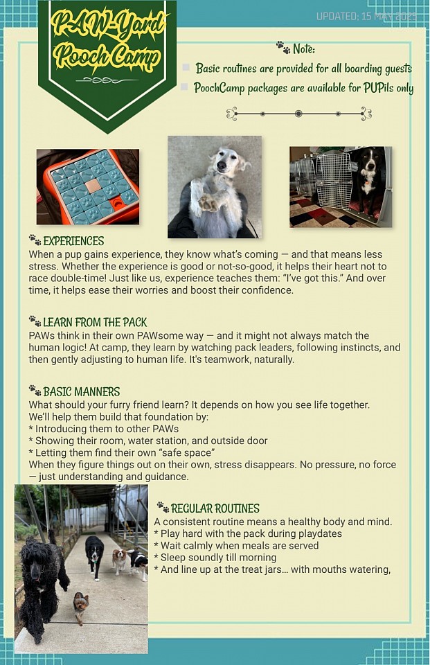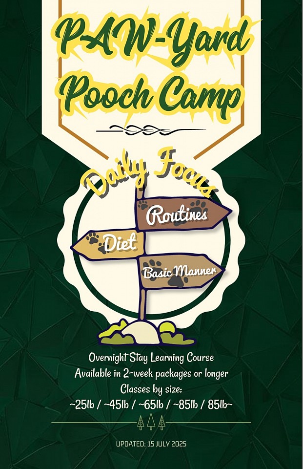 I am not accepting lessons Privately, PoochCamp sessions are only for over 2 weeks boarding guests— when I am not traveling.